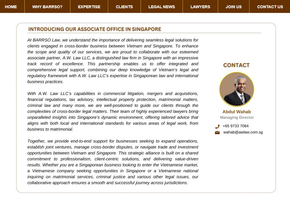 At BARRSO Law, we understand the importance of delivering seamless legal solutions for clients engaged in cross-border business between Vietnam and Singapore. To enhance the scope and quality of our services, we are proud to collaborate with our esteemed associate partner, A.W. Law LLC, a distinguished law firm in Singapore with an impressive track record of excellence. This partnership enables us to offer integrated and comprehensive legal support, combining our deep knowledge of Vietnam’s legal and regulatory framework with A.W. Law LLC’s expertise in Singaporean law and international business practices.